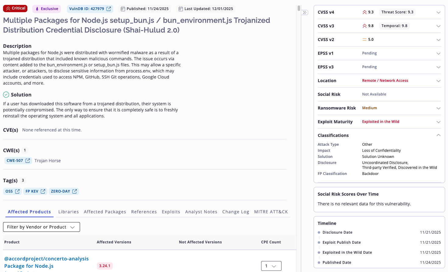 | VulnDB ID: 427979 | Multiple Packages for Node.js setup_bun.js / bun_environment.js Trojanized Distribution Credential Disclosure (Shai-Hulud 2.0) | 5.0 9.8 9.3 | Exploited in the Wild | Credential Disclosure | Medium | N/A | Reinstall |