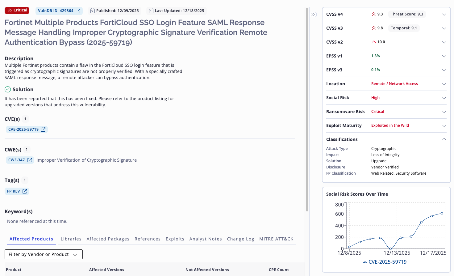 | CVE-2025-59719 | Fortinet Multiple Products FortiCloud SSO Login Feature SAML Response Message Handling Improper Cryptographic Signature Verification Remote Authentication Bypass (2025-59719) | 10.0 9.8 9.3 | Exploit Private | Authentication Bypass | Critical | High | Yes |