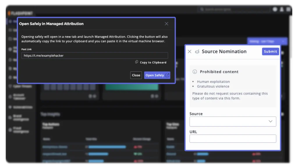 Pivot your investigations between Flashpoint Managed Attribution and Ignite to cover multiple layers of research. Nominate sources from within your Managed Attribution environment to live in the loop of Flashpoint collections.
