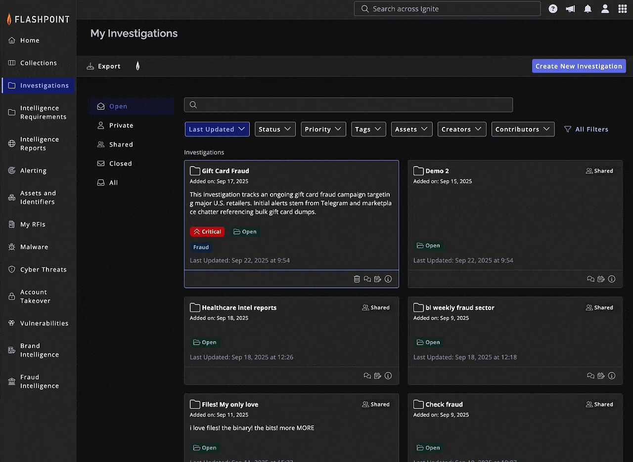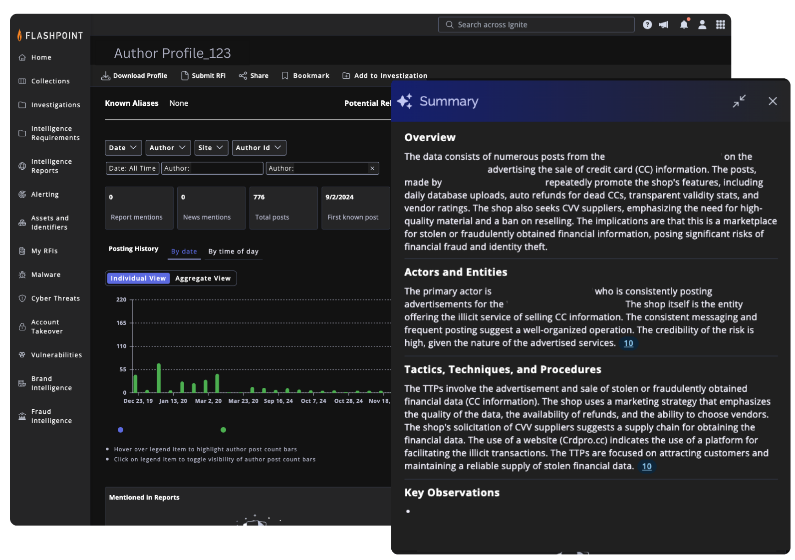 - AI-powered workspace automatically generates structured, reference-backed summaries from saved findings, including Flashpoint data, notes, and custom uploads.