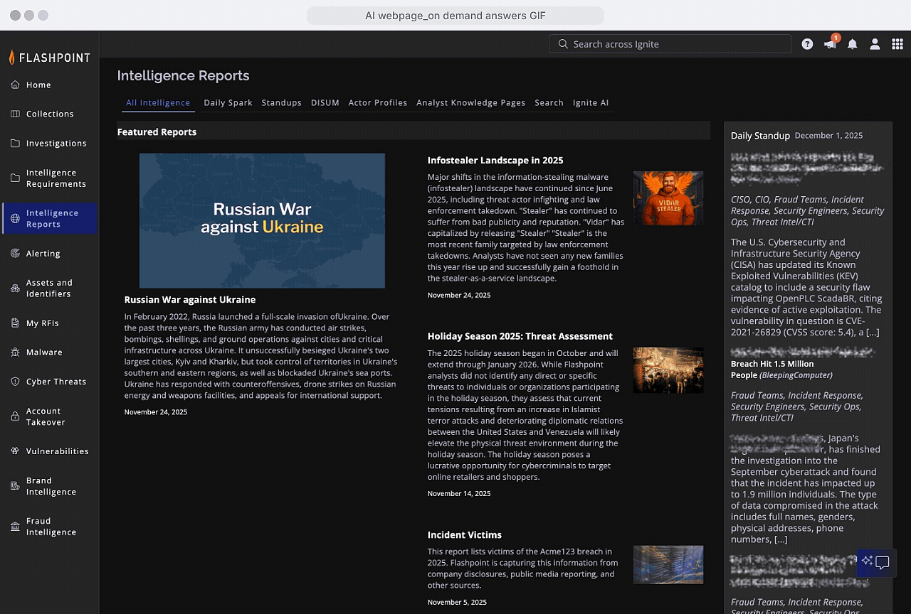 - Quickly surface key takeaways, findings, and context from thousands of Flashpoint analyst reports.