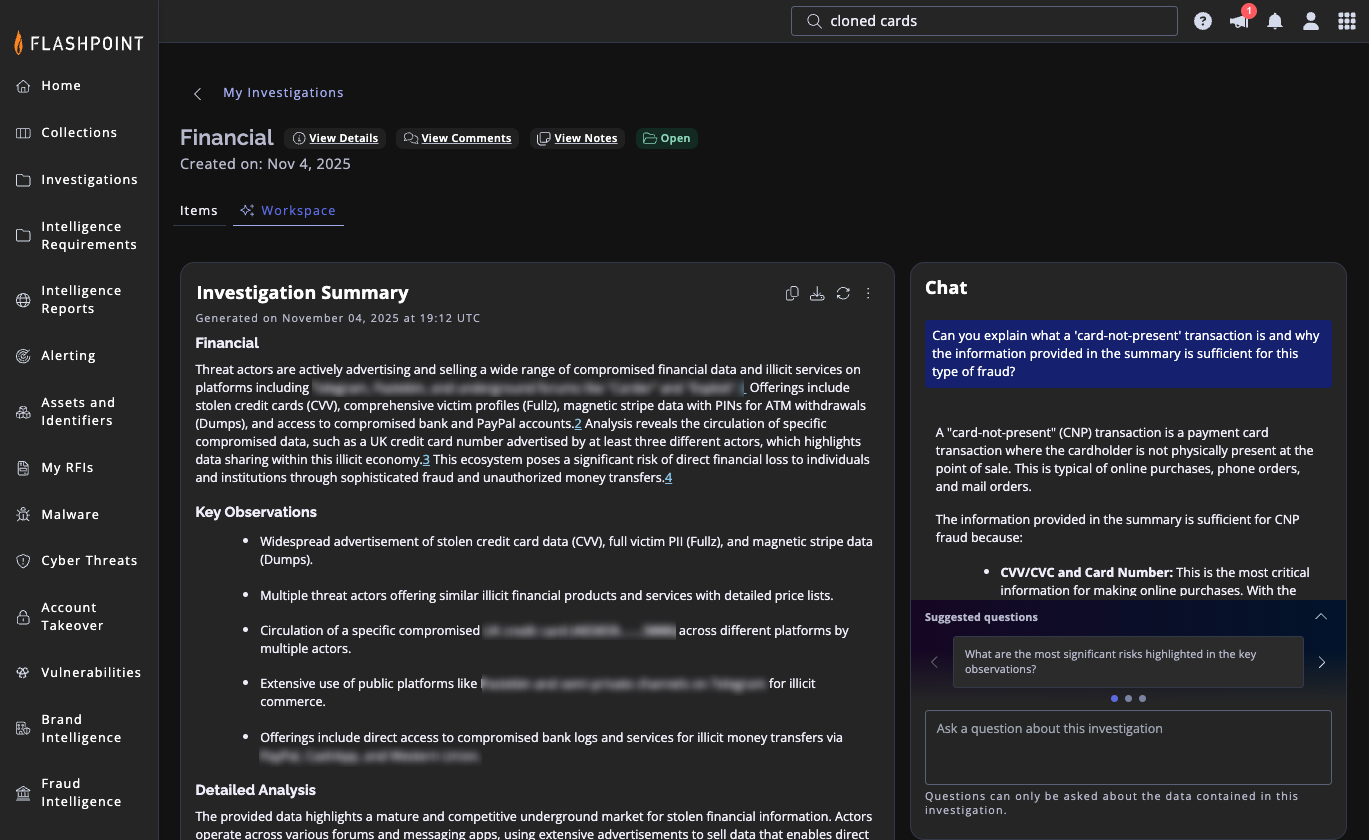 - Feed validated intelligence into fraud engines, SOC workflows, or identity teams.